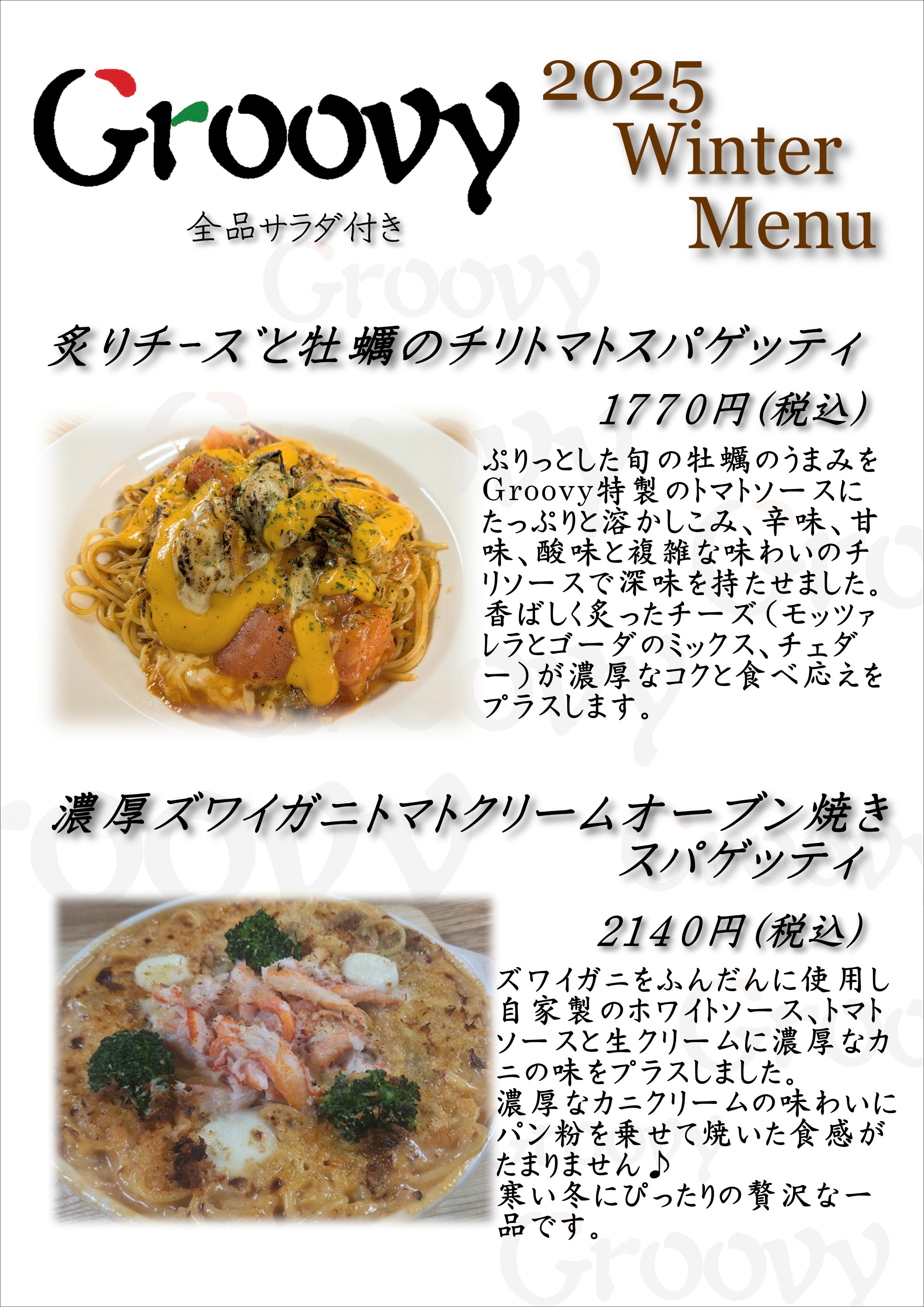 2025年の冬季メニューです 日立店2025-11-29 Groovy日立店のご利用、まことにありがとうございます。 今年も冬季限定メニューが12月1日より販売開始となりました! 今季はパスタ2種類、デザート3種類のラインナップとなっております。 季節を彩る限定メニュー、ぜひご賞味ください!