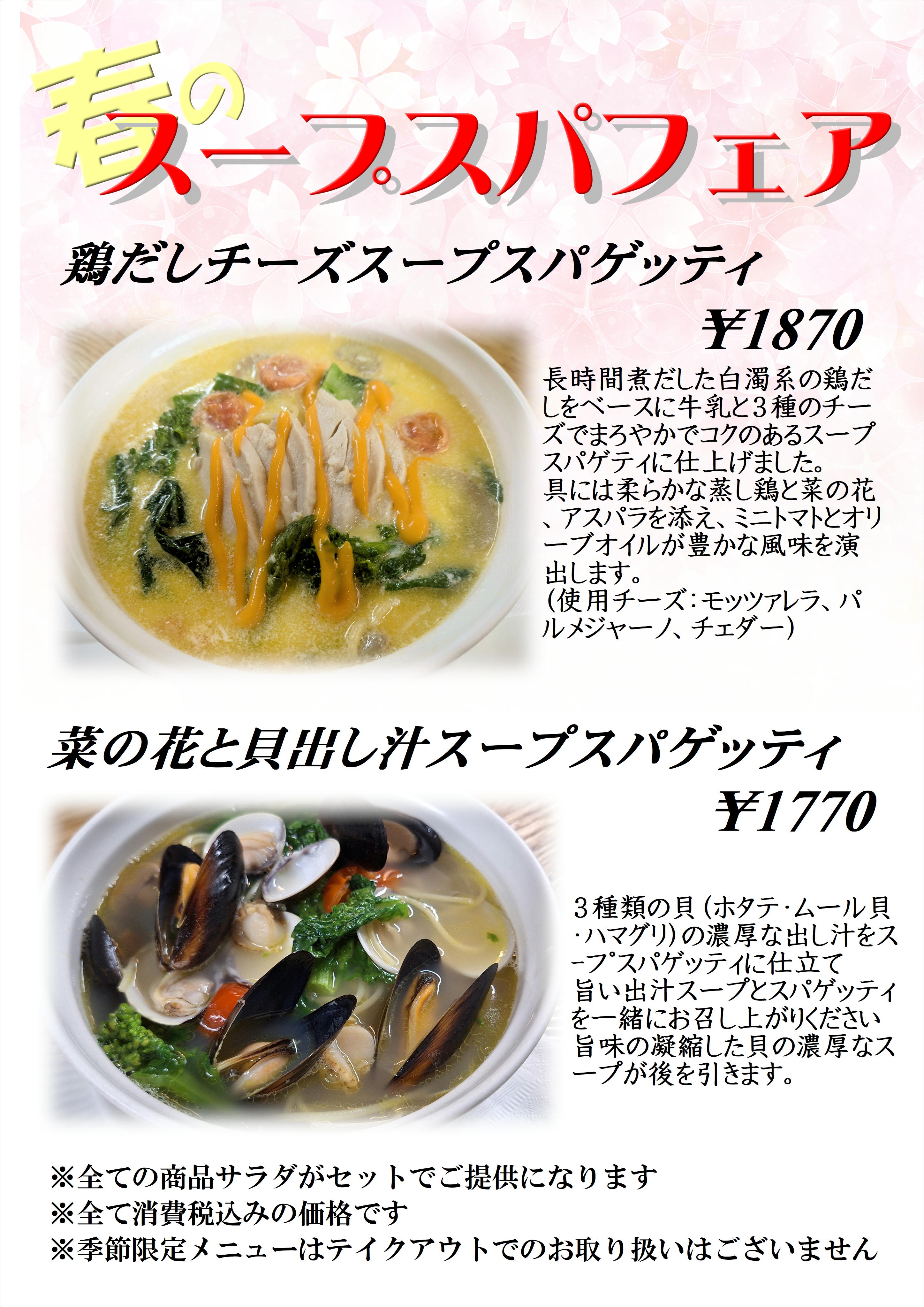 春の季節限定メニューが販売スタート! 日立店2026-03-17 冬の気配もすっかり影を潜め、ずいぶんと春めいてきました。 今年の春メニューはスープスパゲッティーフェア! パスタ2品とデザート3品をご用意しました。 ご来店の際はぜひご賞味ください。